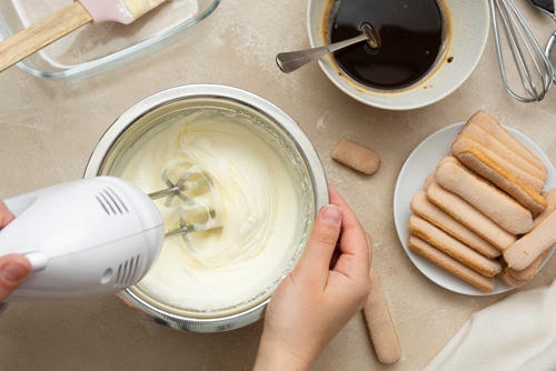 Punem cafeaua îndulcită și răcită într-un recipient potrivit ca dimensiune cu pișcoturile, crema de mascarpone și frișcă într-un poș și pișcoturile pe un platou.