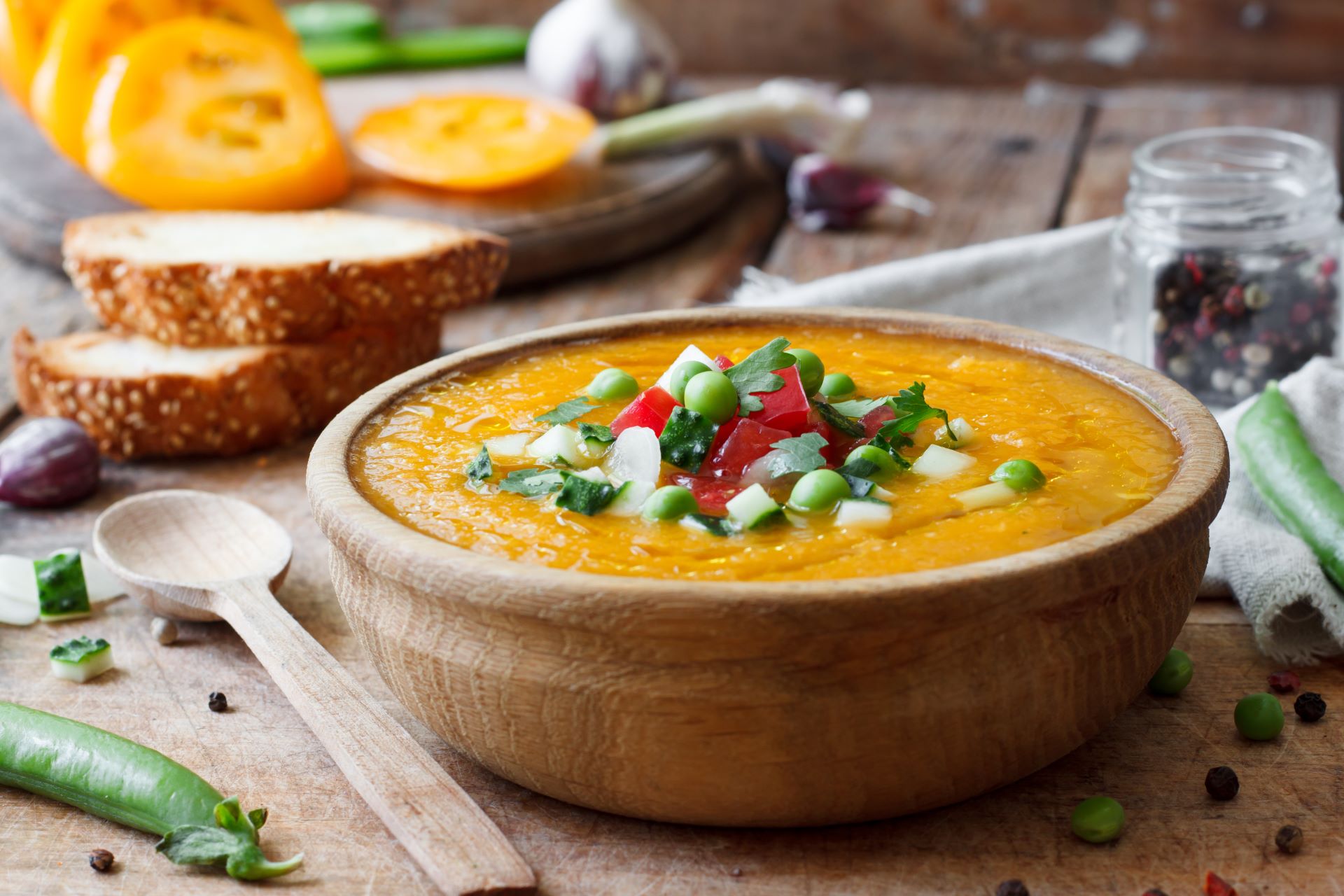 Legenda spune că numele "gazpacho" provine de la termenul arab "caspa", care înseamnă "fragmente", sugerând felul în care legumele erau tocate și amestecate. În timp, rețeta a evoluat și s-a diversificat, fiind adaptată în funcție de preferințele și ingredientele locale - unii adaugă ouă fierte, șuncă, migdale, portocale sau chiar fructe de mare. Tu poți adăuga ceva autentic românesc dacă vrei. De exemplu în magazinele La Doi Pași găsești cârnați de porc subțiri METRO Chef, pe care poți să îi perpelești puțin în tigaie, sau telemea de vacă Hochland, care merge tăiată bucățele și adăugată înainte de servire.
